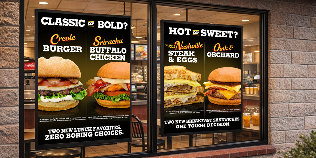 QSR concept project focused on developing new sandwich ideas and presenting them through a cohesive, high-energy campaign system.